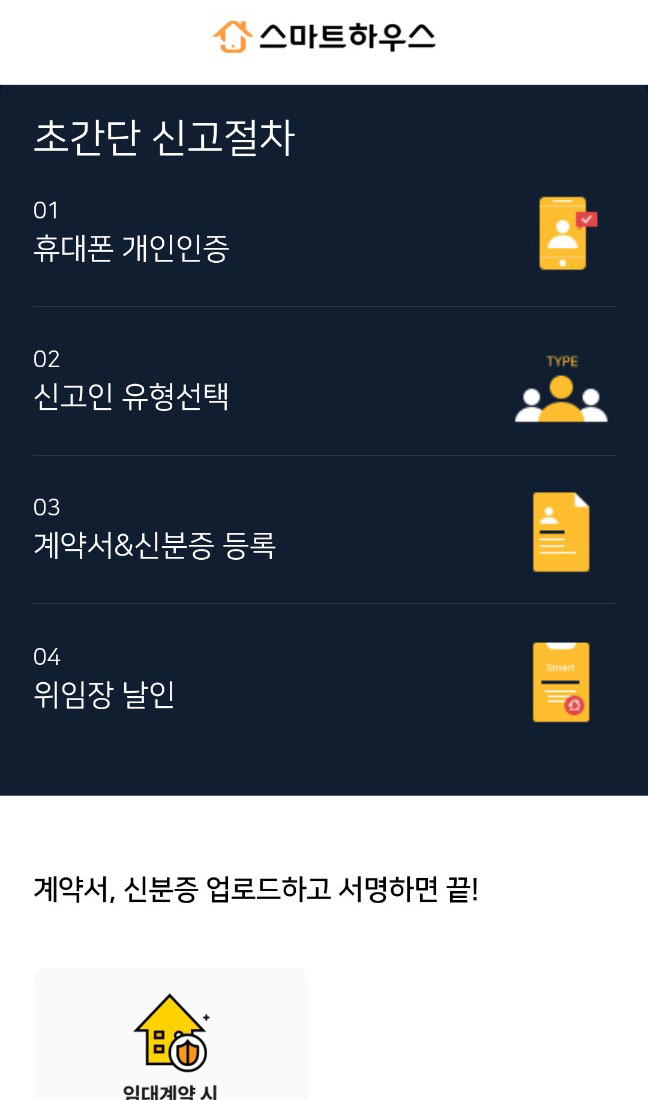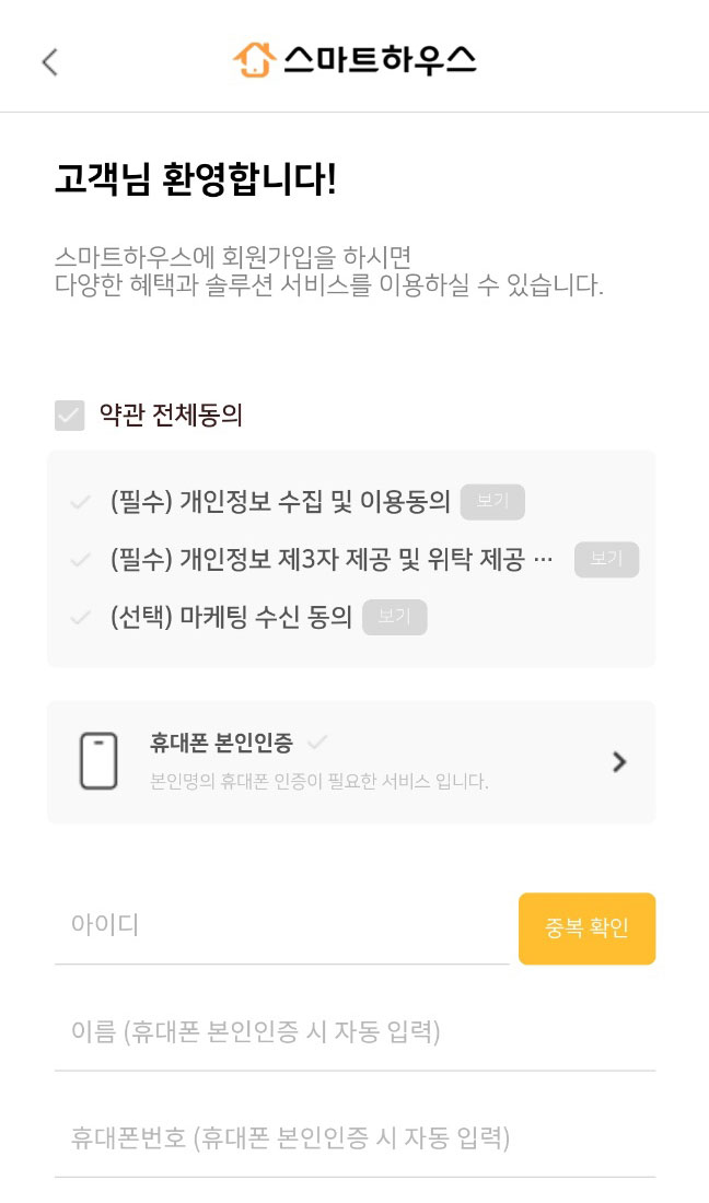스마트하우스 회원으로 가입하신 후 상품담당 매니저에게 연락주시면 바로 사용 가능하도록 처리해 드립니다. 회원가입은 아이디 입력과 본인인증만으로 간편하게 하실 수 있습니다.